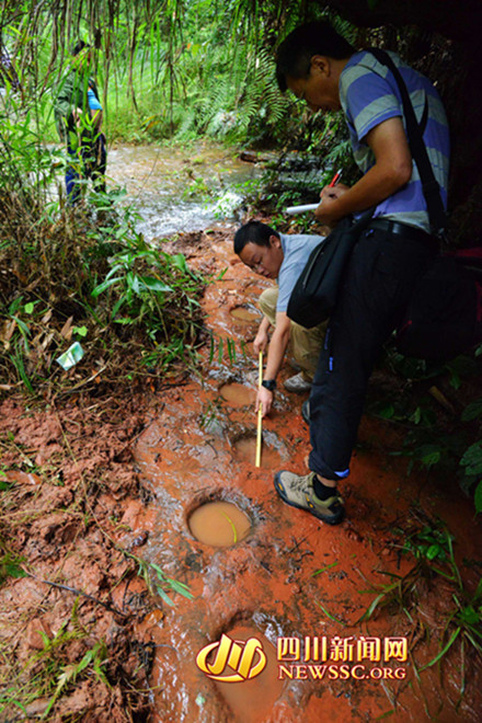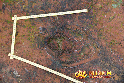 隨后,專家組對大石鄉(xiāng)新陽村桫欏溝恐龍足跡進行考擦,龍井和新陽兩地相距直線距離約1500米。繼上次發(fā)現(xiàn)獸腳類恐龍的巖石上,再次發(fā)現(xiàn)蜥腳類恐龍?!斑@里保存著極好的獸腳類恐龍行跡?!鲍F腳類恐龍是一種兇猛的肉食性恐龍,是當(dāng)?shù)匕l(fā)現(xiàn)的蜥腳類足跡和鳥腳類足跡的造跡者的天敵。從足跡可推斷獸腳類恐龍長約4-6米。生活年代在白堊紀(jì)時期,距今約一億年。